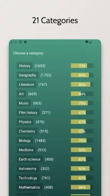 W odróżnieniu od wielu innych gier, ten quiz konsekwentnie unika pytań z kultury popularnej, skupiając się wyłącznie na wiedzy ogólnej i rozwijaniu edukacji. Tysiące unikalnych pytań, czerpiących z szerokiego spektrum dziedzin, gwarantują niekończący się strumień intelektualnych wyzwań. Wybieraj spośród takich kategorii jak: Historia, Geografia, Literatura, Sztuka, Muzyka, Historia Filmu, Fizyka, Chemia, Biologia, Medycyna, Nauki o Ziemi, Astronomia, Technologia, Matematyka, Język, Nauki Społeczne, Filozofia, Religia, Biznes i Finanse, Sport oraz Kulinaria. Co więcej, każde pytanie jest połączone z artykułem w Wikipedii, co pozwala na natychmiastowe pogłębianie wiedzy. Śledź swoje postępy za pomocą systemu rankingowego Elo i porównuj swoje osiągnięcia z innymi graczami, budując swoją reputację eksperta.